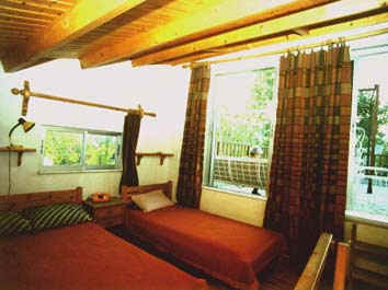 Kleines, separates Zimmer beim Clubraum des Haupthauses (Souterrain): 2 Einzelbetten, kleine Veranda umrahmt von Blumen mit Blick auf den Garten |