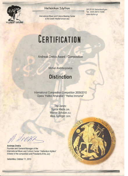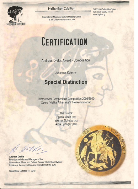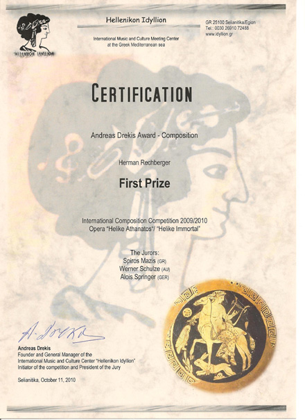 For a first impression, an orchestra is planning to play a concert on the island Kefalonia, in Olympia, in Corinth, in Galaxithi near Delphi and at Hellenikon Idyllion in the end of July End of July. Where honored pieces will be presented. Furthermore two recommended compositions for representation will be presented for the first time this July and September in concerts, in Athens, Olympia und Corinth.