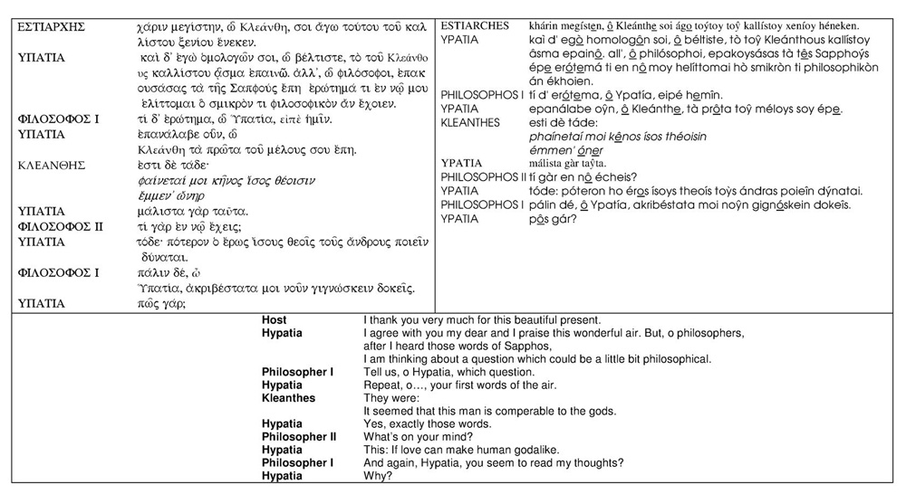 Hypatia (Philosopher woman): Coloratura Mezzo-Soprano Philosophos I (Philosopher 1): Actor Philosophos II (Philosopher 2): Actor Kyrios I (Gentlemen 1): Actor
