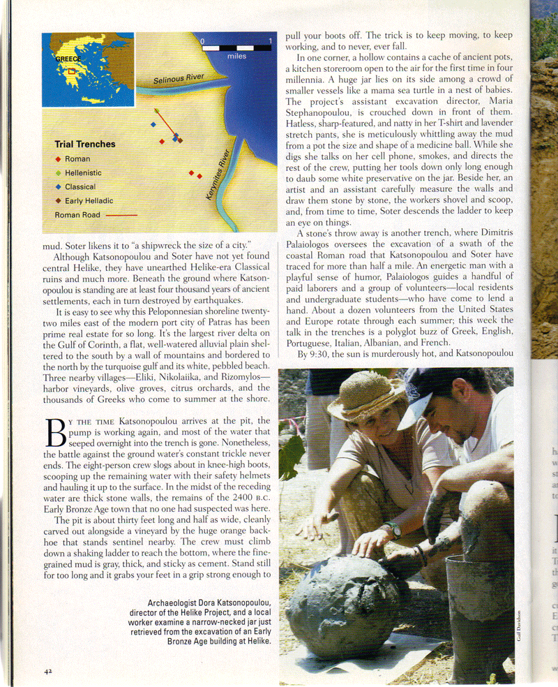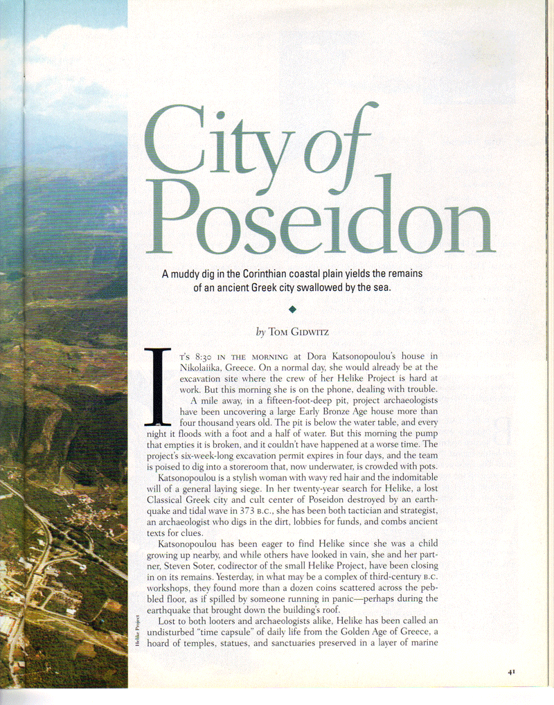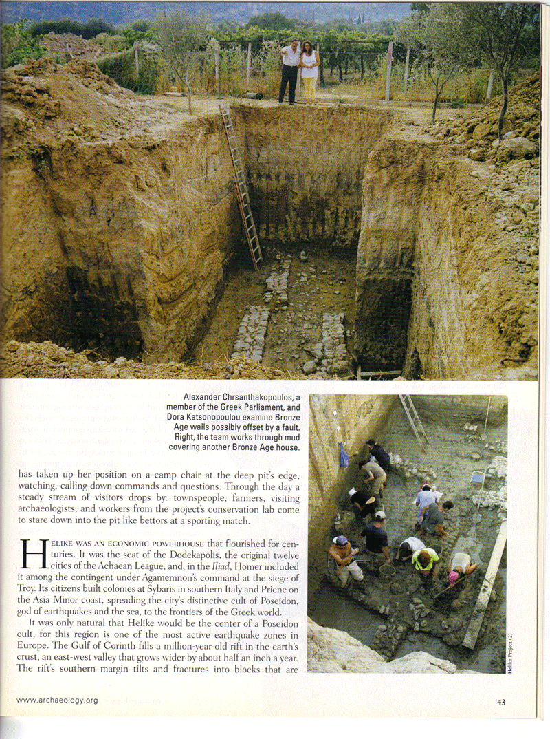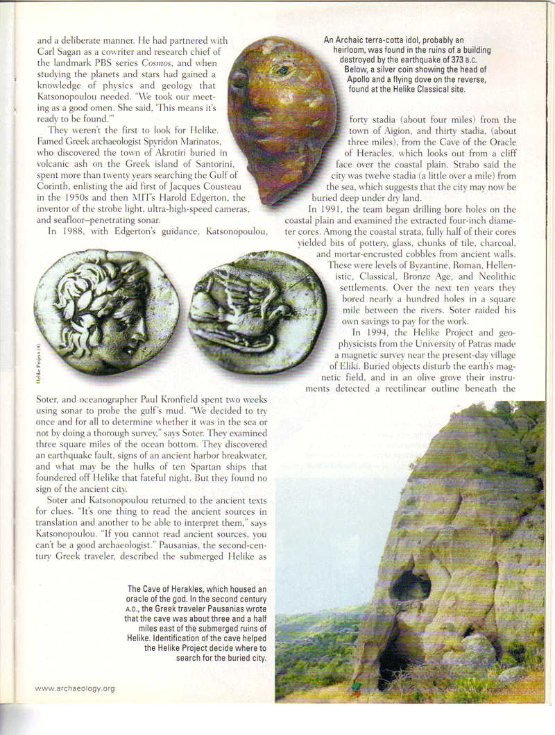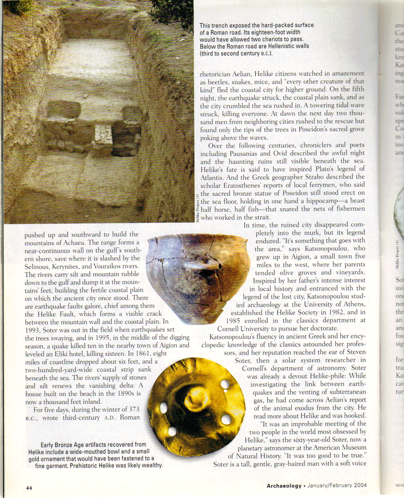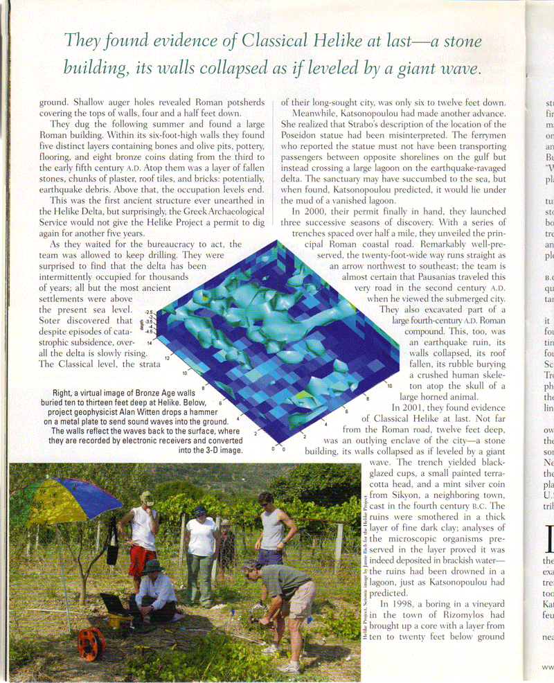 Greek archaeologist Dora Katsonopoulou and American physicist Steven Soter, after 19 years research, discovered in the summer of 2000 first clues to the lost Classical city of Helike in Achaia.