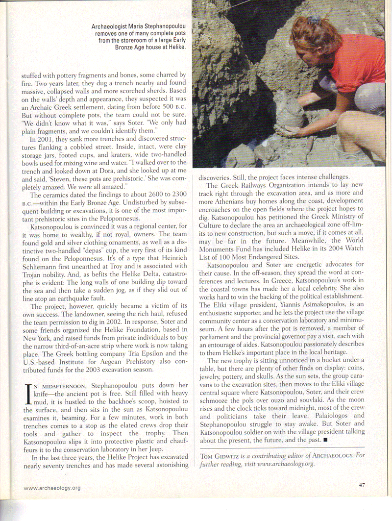 To continue with further excavations at the site of Helike is a irresistible challenge for Dora Katsanopoulou and Steven Soter, planned for summer 2010. They hope to bring about the secret of a grand city of the classical period of Greece, that has been kept undisturbed for 2500 years. It is placed at the southern Gulfe of Korinth, 12 km east of Selianitika.