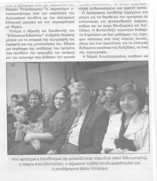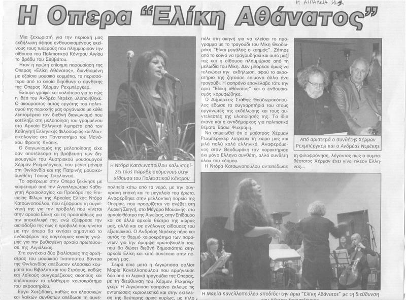 Planned are concerts in Nikea Athens in Kipotheatro at 19. 9. , 21.00 h and in Egion in archeological museum at 20.9. , 21.00 h with music from operas, international volksongs and as a high point music with texts by Pindar from our international music composition competition Olympia 2004 Entrance free!