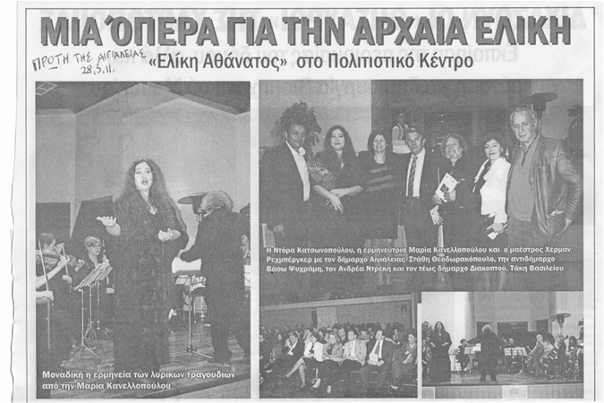 For a first impression, an orchestra is planning to play a concert on the island Kefalonia, in Olympia, in Corinth, in Galaxithi near Delphi and at Hellenikon Idyllion in the end of July End of July. Where honored pieces will be presented. Furthermore two recommended compositions for representation will be presented for the first time this July and September in concerts, in Athens, Olympia und Corinth.