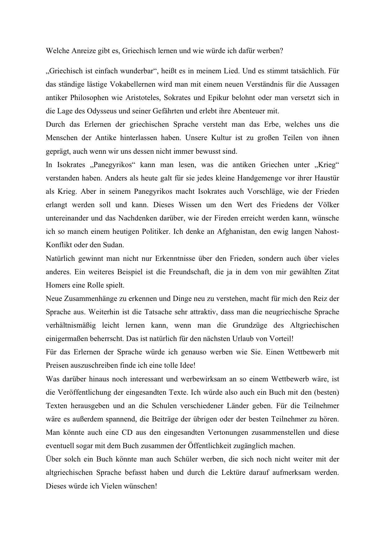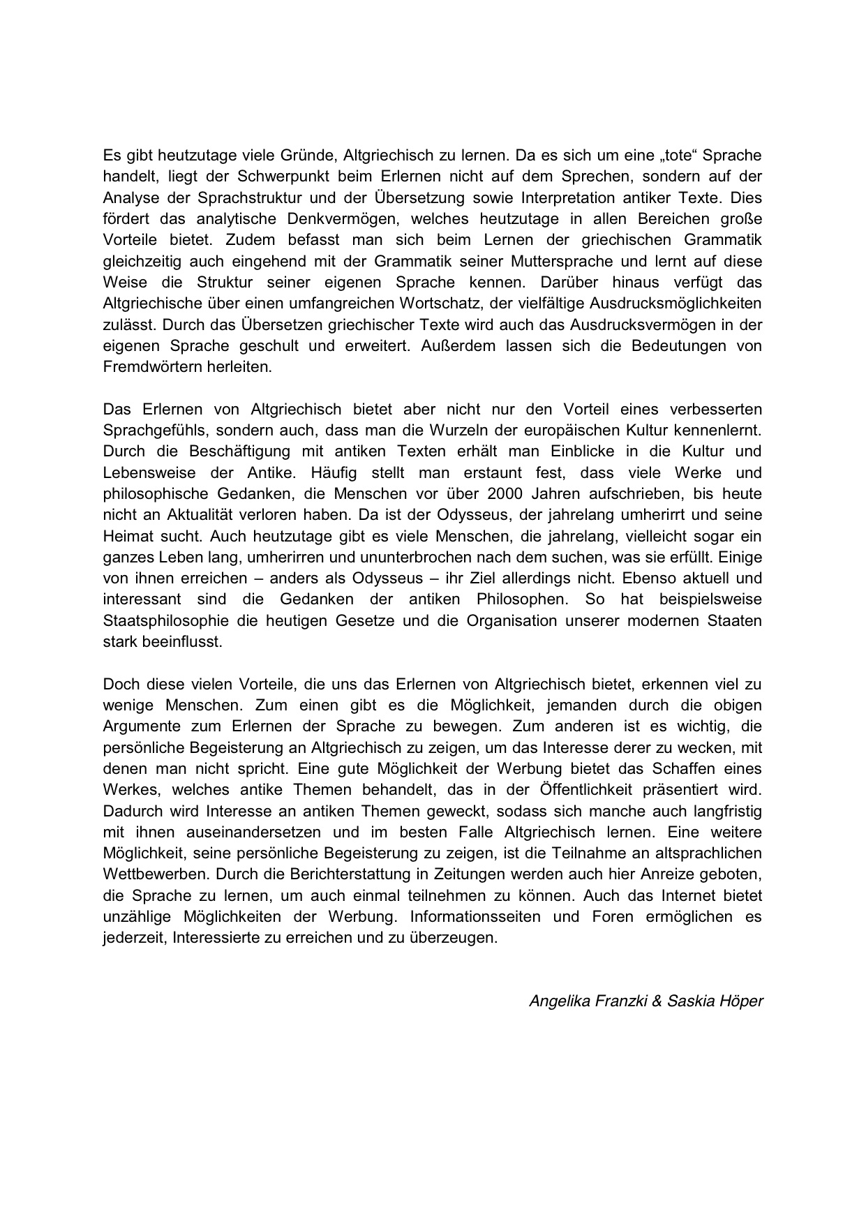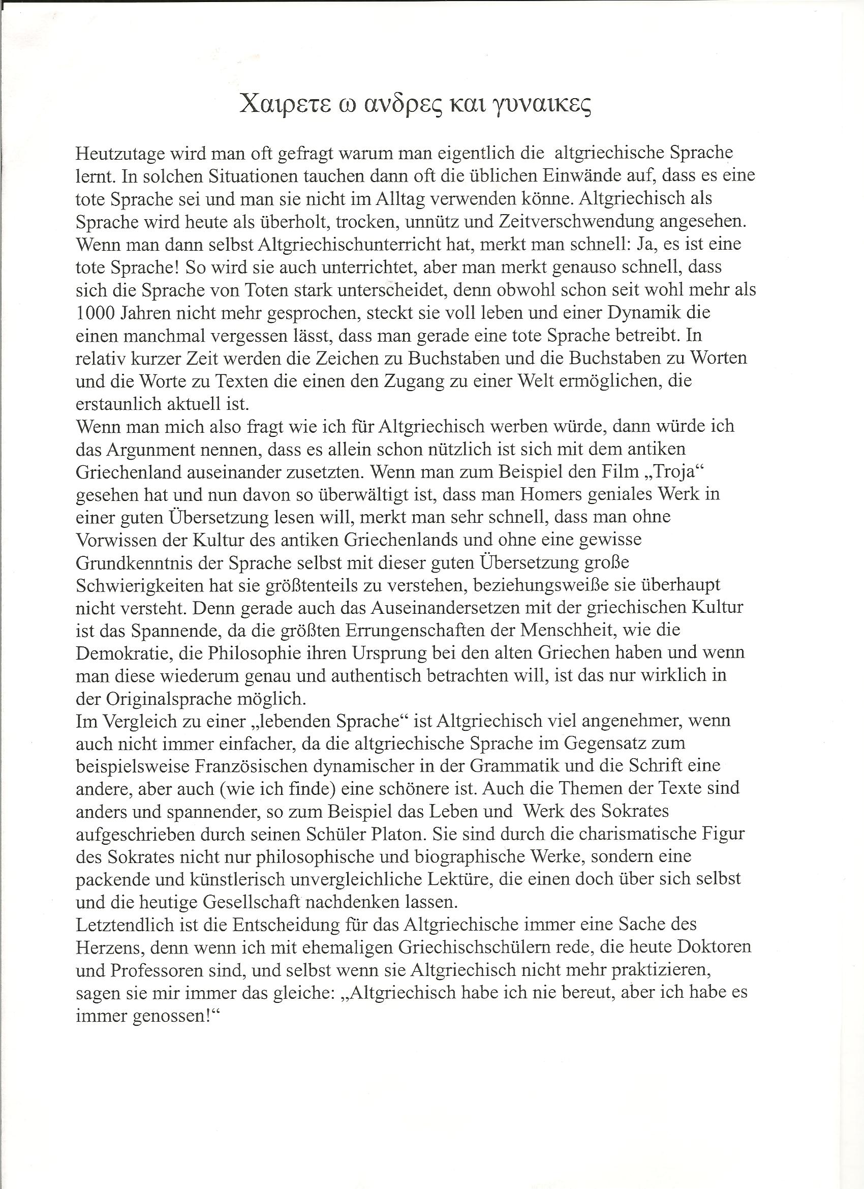 4. Verfasse ein Statement (ca. 400 Wörter) darüber, welche Anreize es heutzutage gibt, altgriechisch zu lernen und wie Du persönlich für das Erlernen der Sprache werben würdest.
