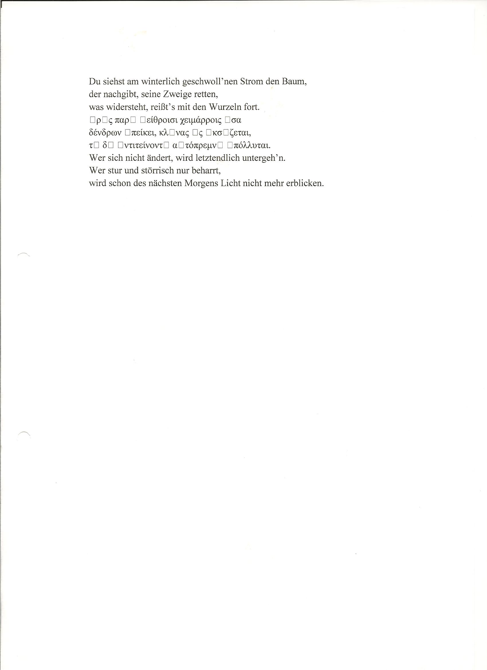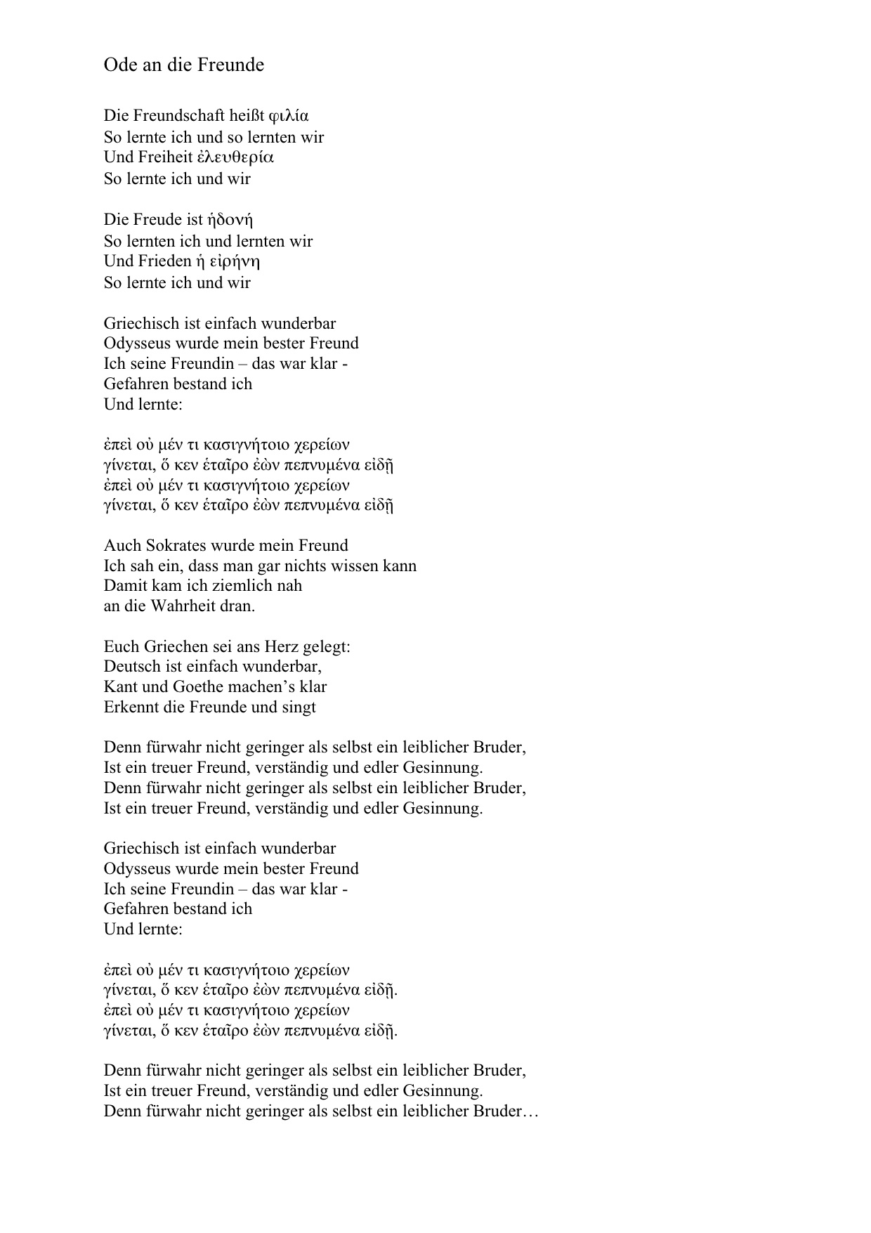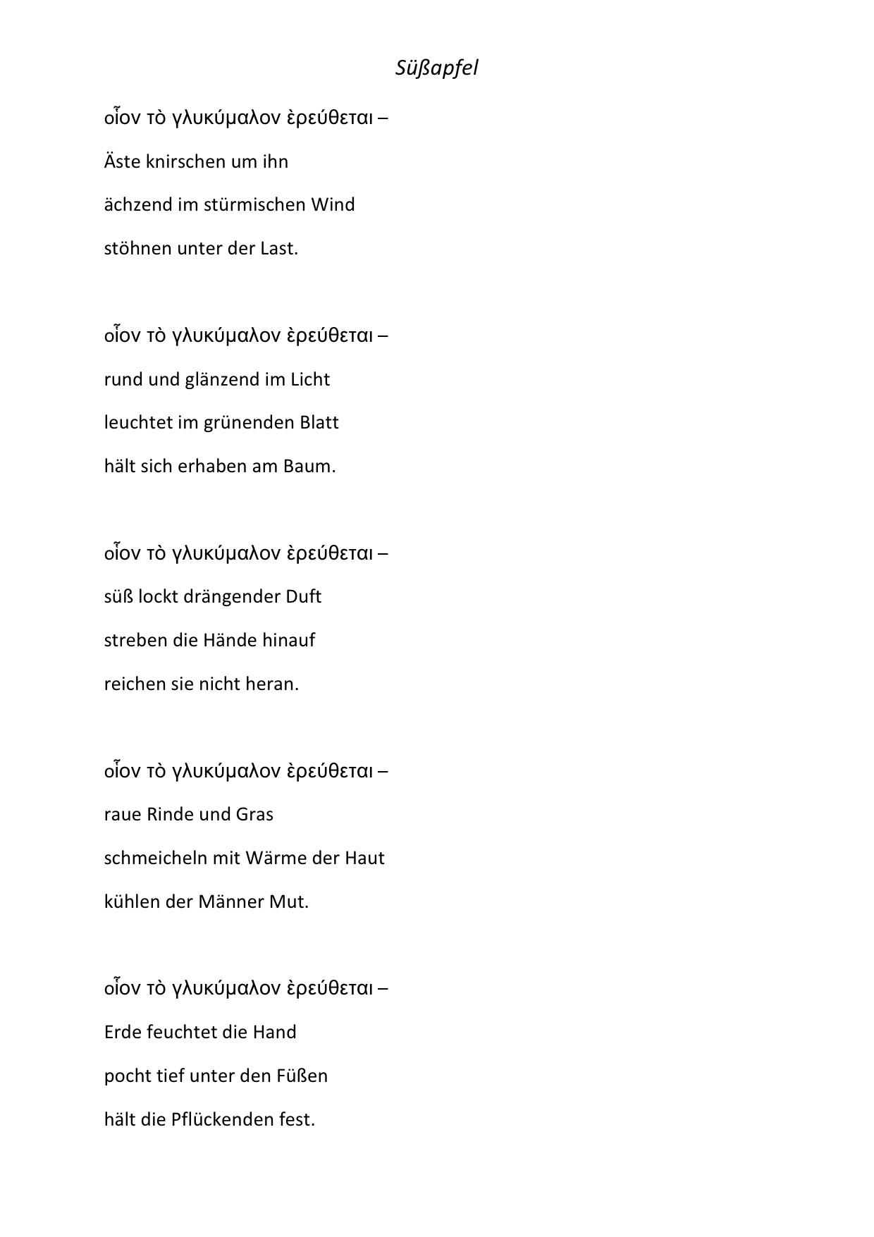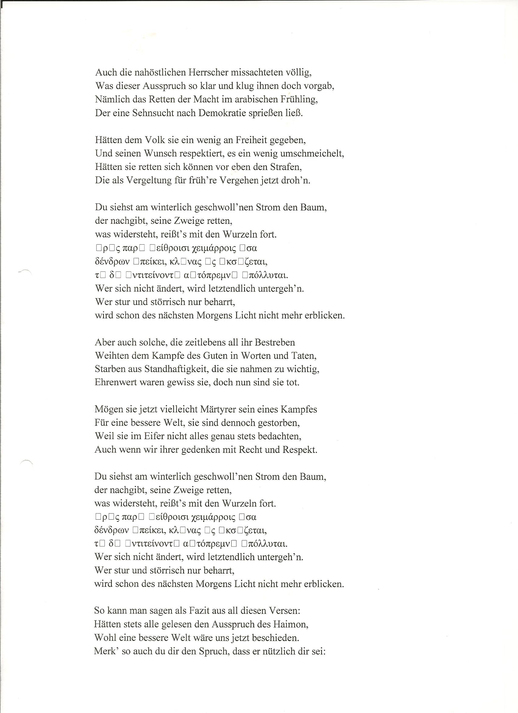 2. Verfasse unter Einbindung dieses Spruchs/ dieser Strophe ein Gedicht in deutscher, englischer, französischer oder neugriechischer Sprache, das den Sinn und die Aussagekraft dieses Spruches/ dieser Strophe wiedergibt und weiterführt. Hierbei soll der Spruch/ die Strophe und, wenn möglich, auch seine Übersetzung im Refrain in seiner ursprünglich erasmischen Aussprache wiederkehren.