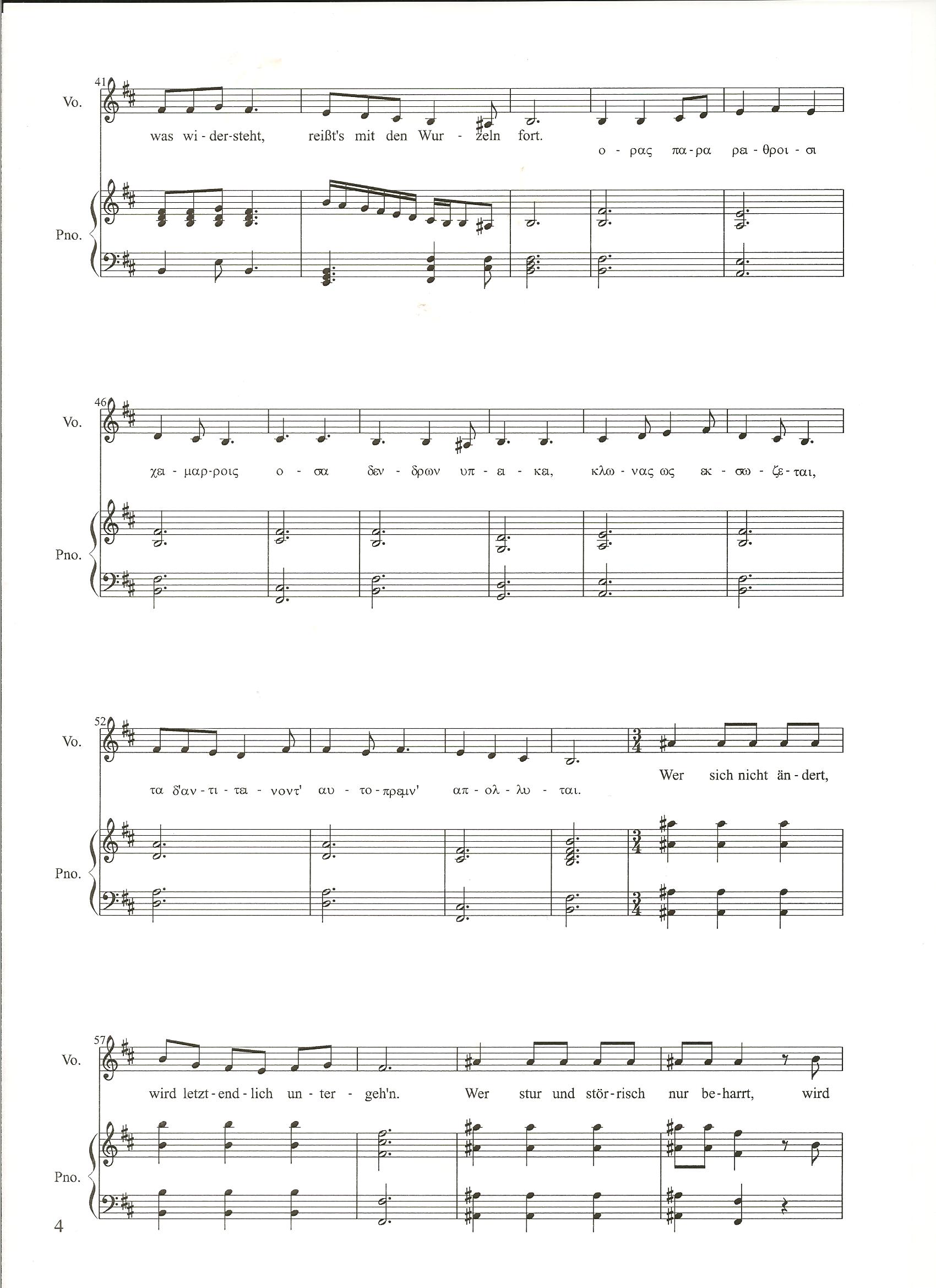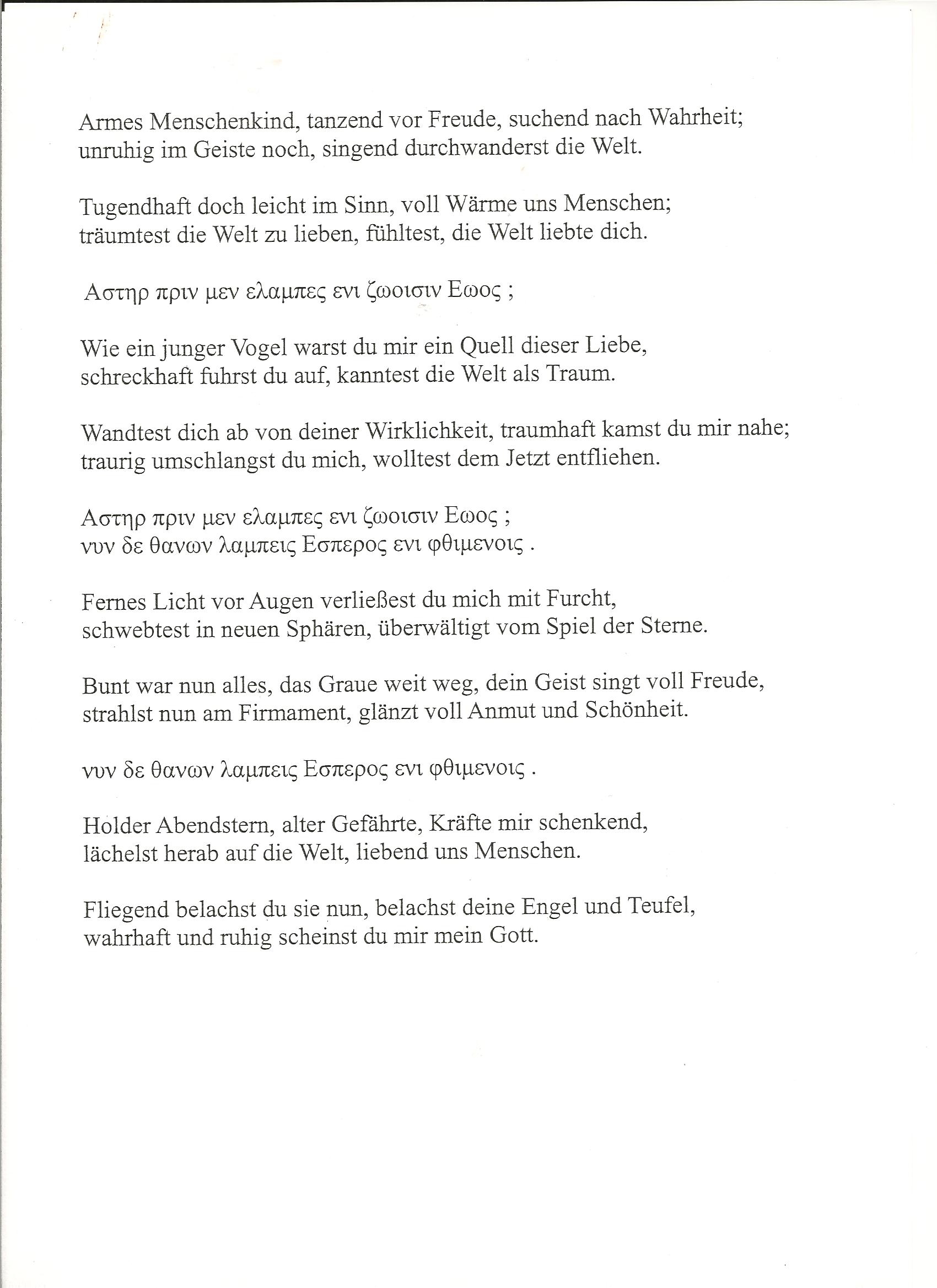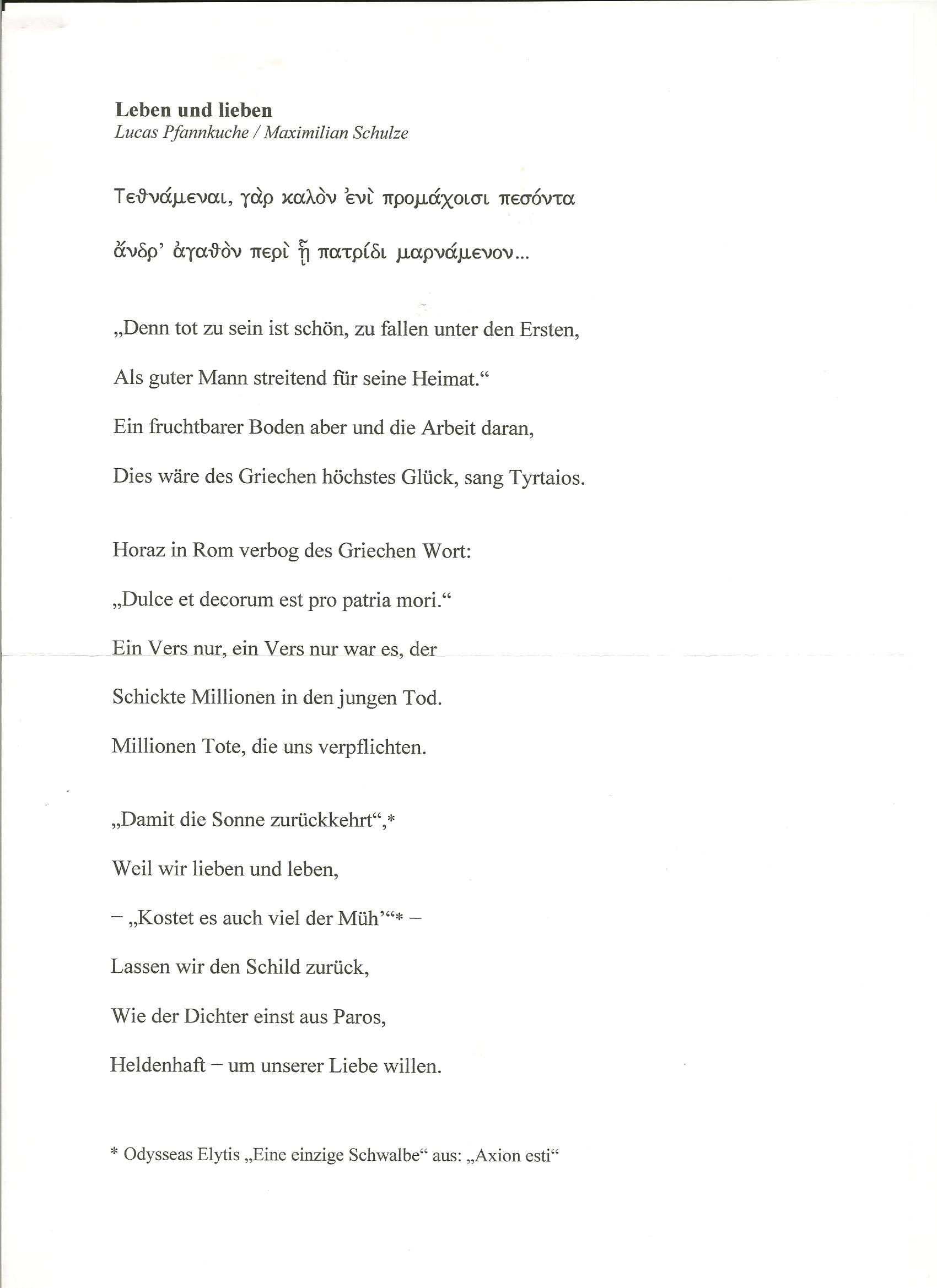 2. Verfasse unter Einbindung dieses Spruchs/ dieser Strophe ein Gedicht in deutscher, englischer, französischer oder neugriechischer Sprache, das den Sinn und die Aussagekraft dieses Spruches/ dieser Strophe wiedergibt und weiterführt. Hierbei soll der Spruch/ die Strophe und, wenn möglich, auch seine Übersetzung im Refrain in seiner ursprünglich erasmischen Aussprache wiederkehren.